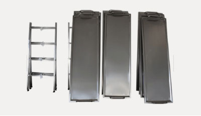 Каждый слой снабжен подносом для тела с ручками, прочными и устойчивыми. Каждая полка на роликах, запирается и легко выдвигается.
